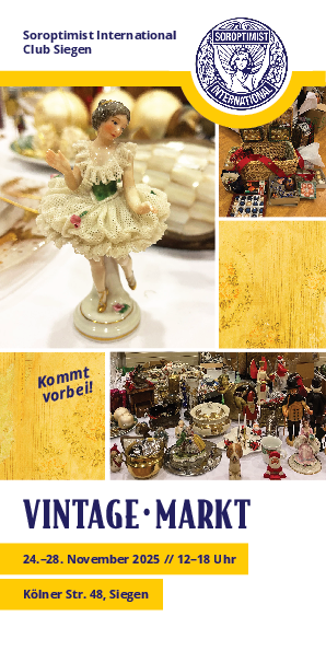 Herzlich willkommen zu unserem VINTAGE · MARKT Was? Stöbern, entdecken, Gutes tun! Bei unserem 5-tägigen Vintage-Markt im noch leerstehenden Ladenlokal des Food- sharing Café Siegen e.V. gegenüber vom Dicken Turm findest du alles von edlen Einzelstücken bis hin zu charmantem Trödel. Der Erlös wird wie immer an eine soziale Einrichtung gespendet. Wir freuen uns auf deinen Besuch! Wo? Kölner Str. 48, Siegen „Am dicken Turm“ Wann? 24. bis 28. November 2025 12 bis 18 Uhr |